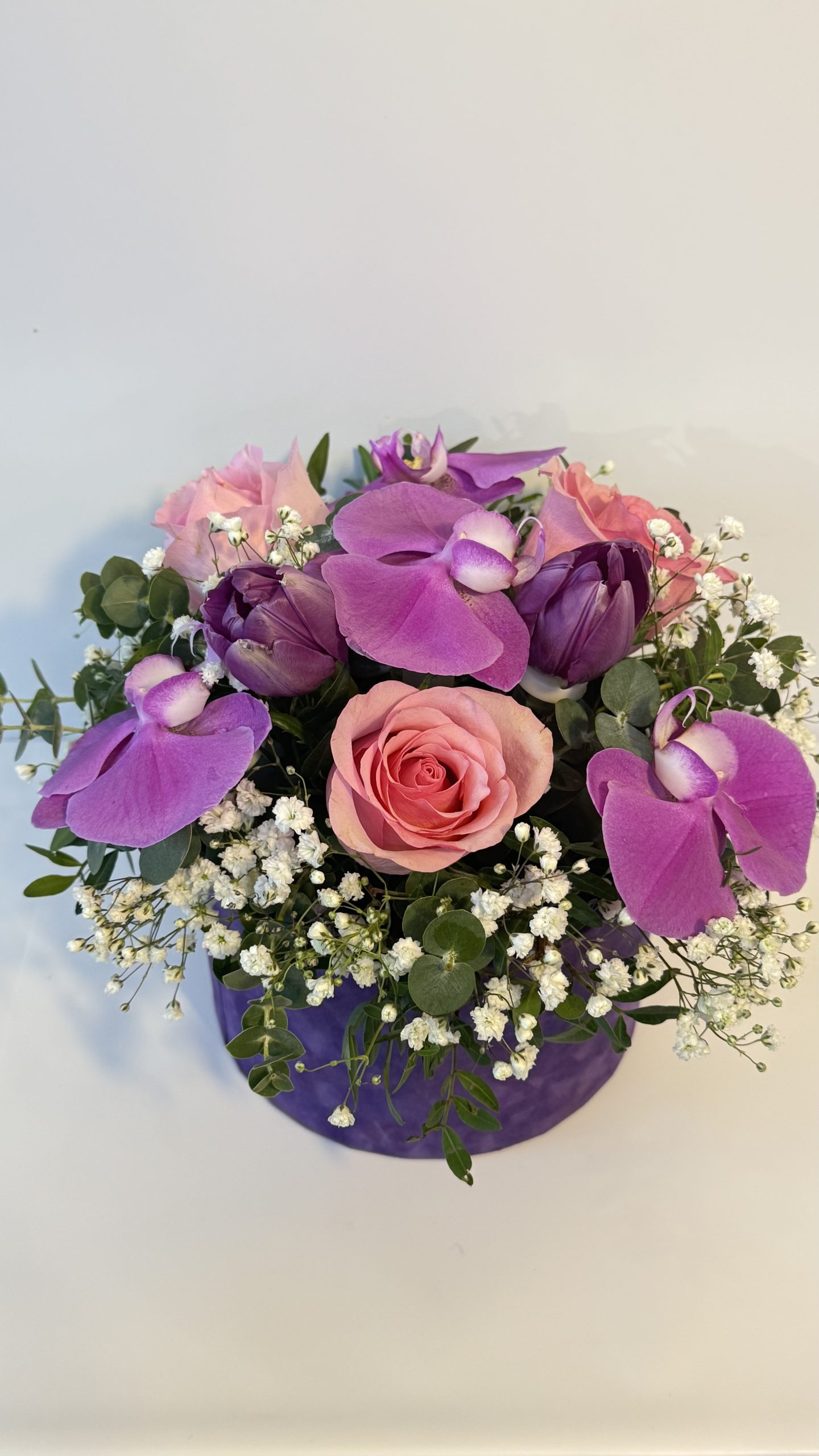 Compozitie : trandafiri , lalele , orhodee phalaenopsis , gypsofila , lalele , eucalipt .