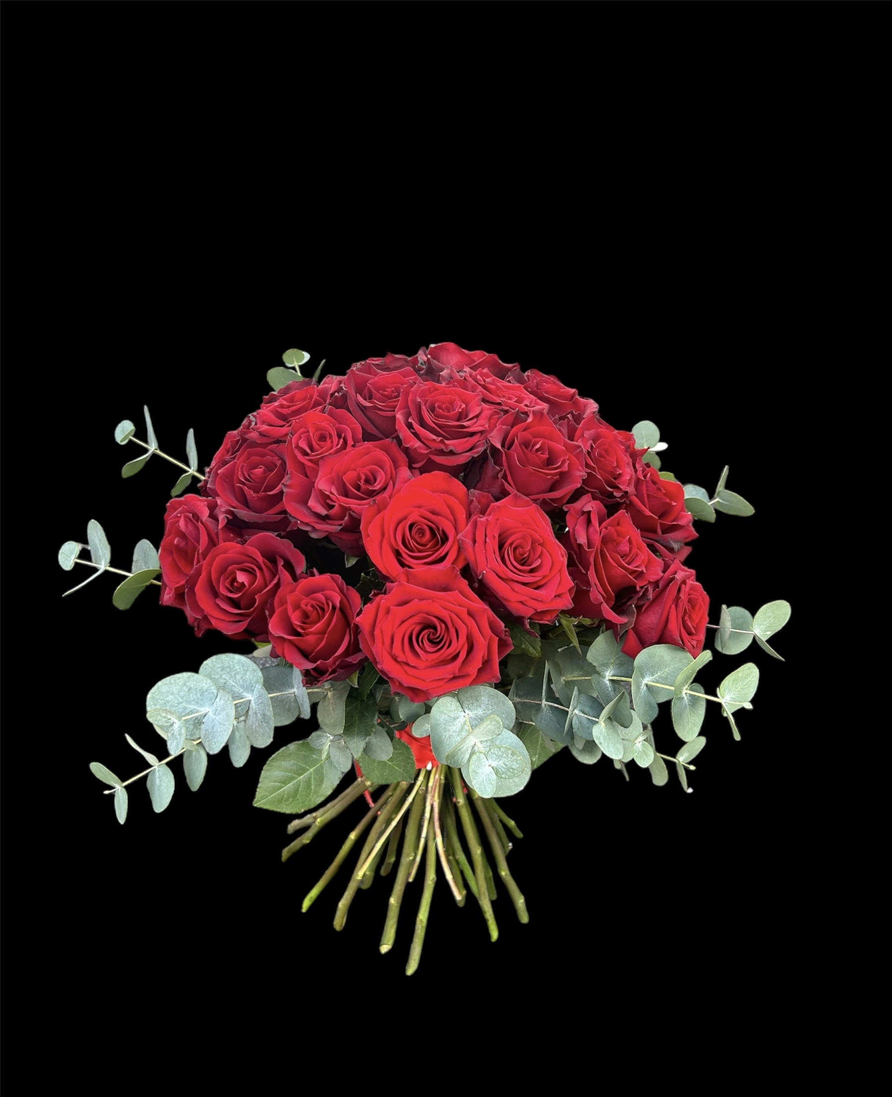 Compozitie : Produsul continene 25 trandafiri rosii,eucalipt,panglica rosie.