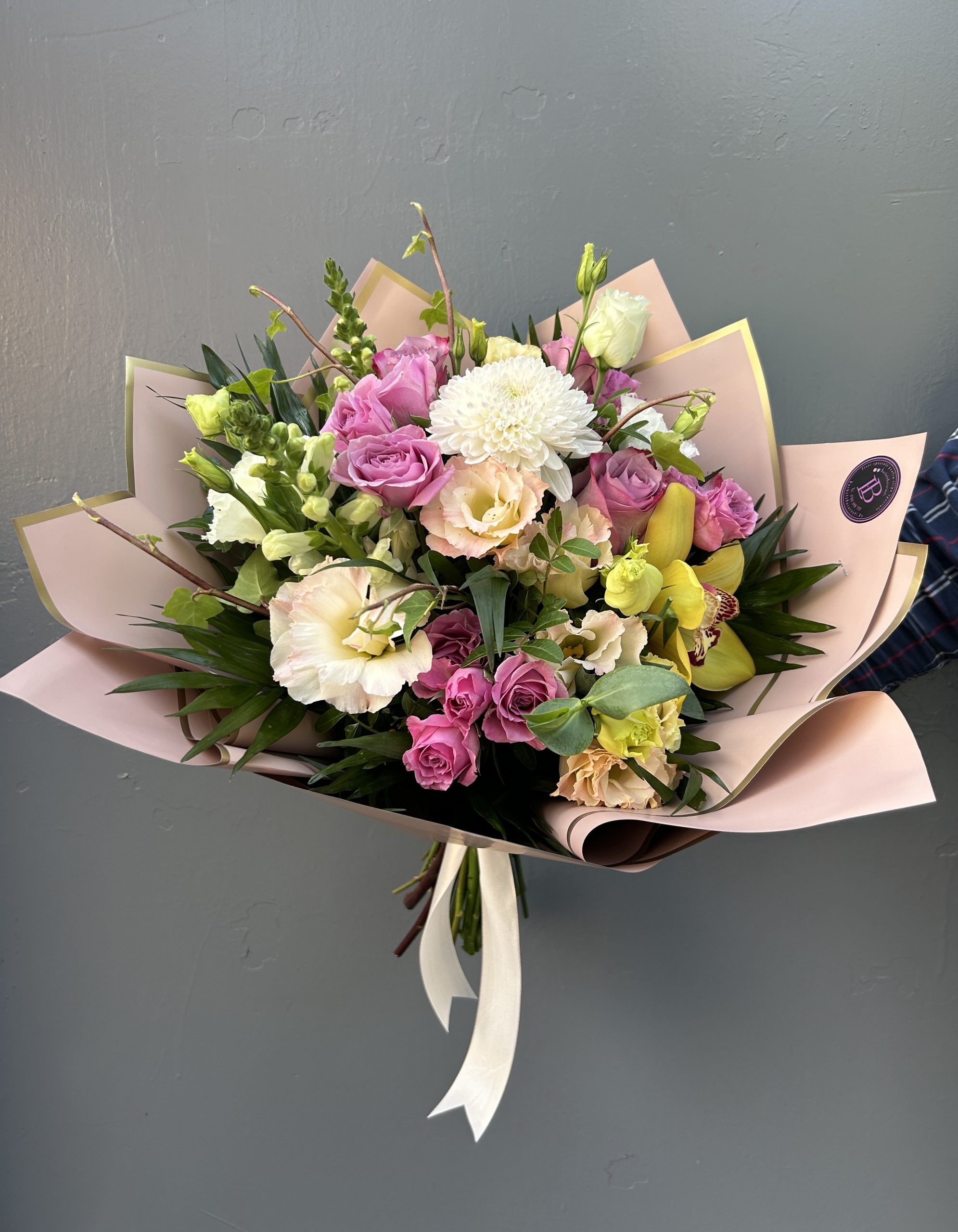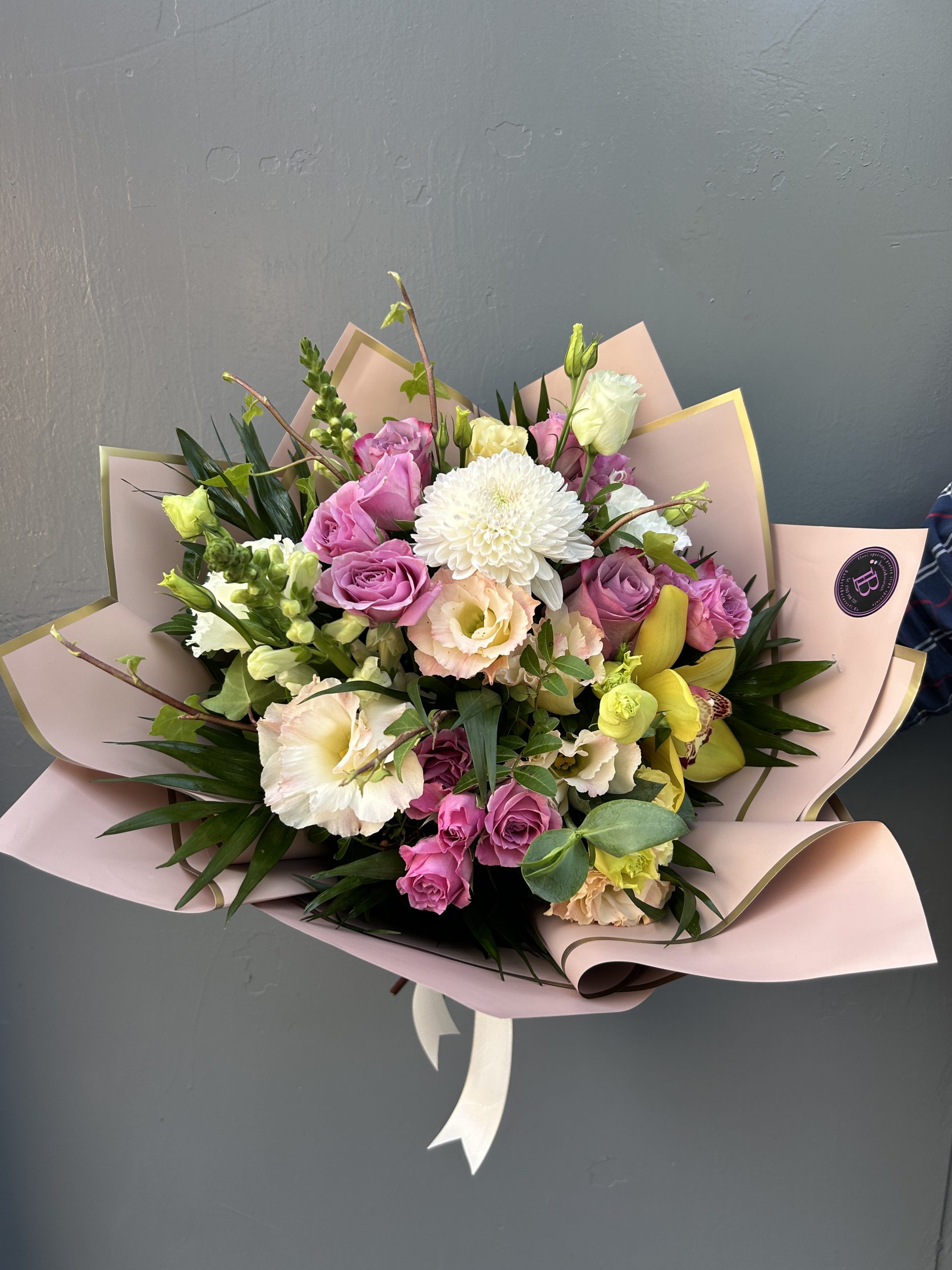 Compozitie : dalii,orhidee cymbidium,trandafiri,mathiola,solidago,alstroemeria,minitrandafiri,verdeata si ambalaj.