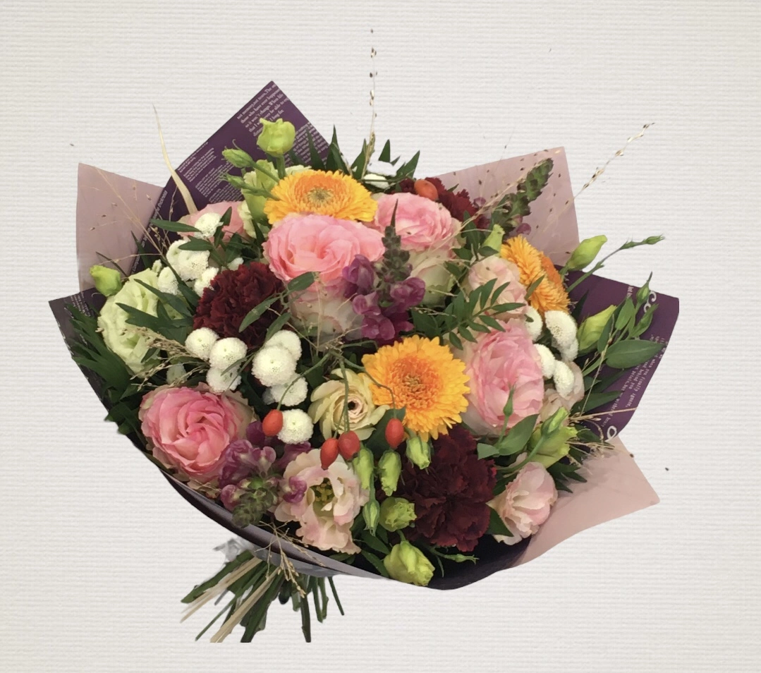 Buchetul contine; hypericum, trandafiri, minigerbera, gura leului, dianthus, santini, verdeata, ambalaj.Felicitare cadou.Livrare gratuita.