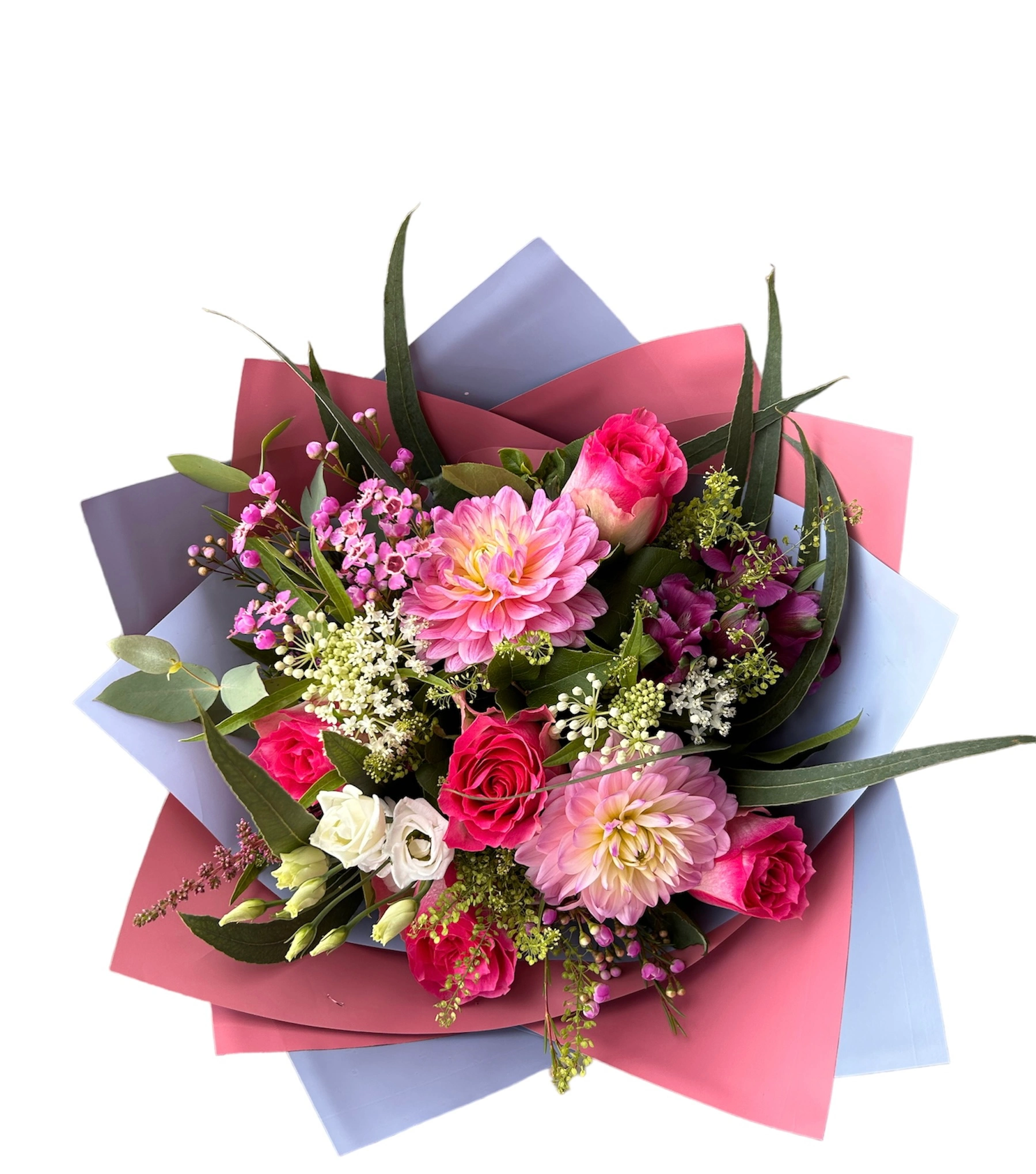 Compozitie: trandafiri roz, dalii, wax flowers, asclepias ,alstroemeria ,verdeata si amabalaj.