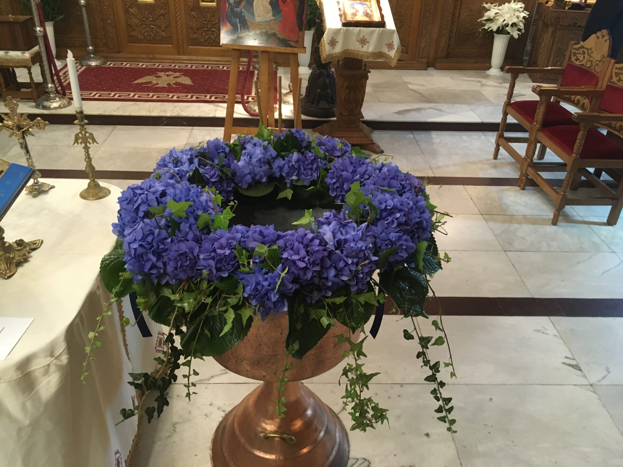 Decor cristelnita cu hortensii este un aranjament floral pentru taina Botezului. Decor cristelnita cu hortensii , este compus din : cadru pentru flori creat handmade , hortensii , eucalipt , hedera . Se poate personaliza si pe alte culori.