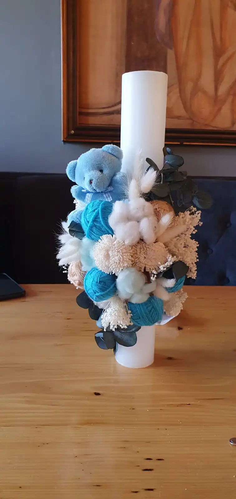 Lumanare botez cu gheme si flori este realizata handmade din gheme , flori criogenate si uscate.