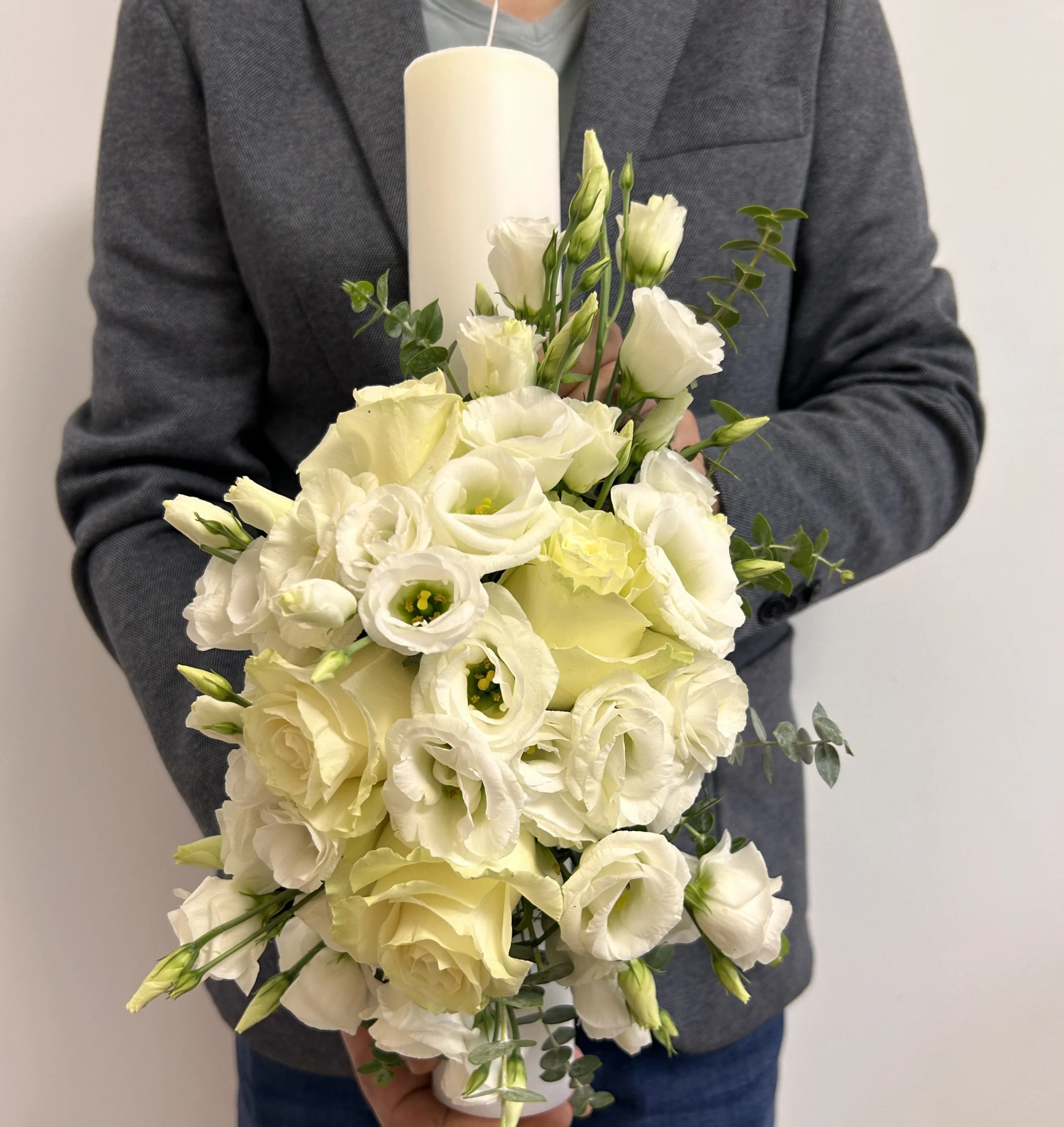 Lumanare de Botez cu flori albe este realizata din lisanthus alb, trandafiri albi si eucalipt. Inatimea lumanarii este de 40 cm si diametru de 6 cm .